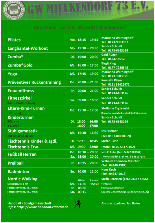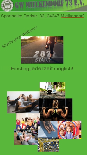 Ob in der Halle oder im Freien - GW Mielkendorf 73 e.V. bietet zu jeder Jahreszeit ein abwechslungsreiches Programm. Unser vielfältiges Angebot bietet Jung und Alt die Möglichkeit, Sport in der Gruppe zum Erlebnis zu machen.